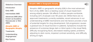 If you scroll/move down the page, you’ll find a section about Geographic Atrophy. This site gives you the ability to hear the text (convert text to speech) if you select the speaker icon in the upper right of any section.