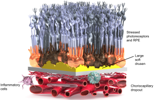 In the middle of the illustration, drusen are shown as a yellow ‘clump’ under the RPEs and above the blood supply in what is called the choroid. Between the choroid and the RPEs is Bruch’s membrane.