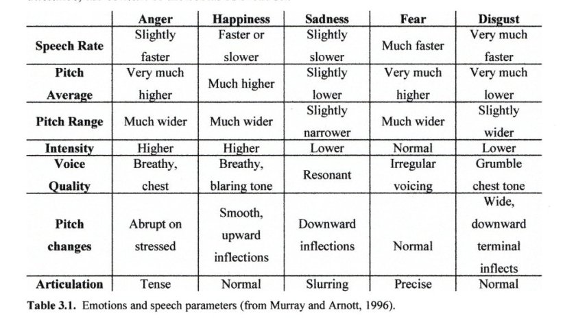 Quite a while back an Italian study, Extracting Emotions and Communication Styles from Prosody, included some neat charts that are basically a guide to identifying speaker emotion from prosody. Prosody is the pattern of stresses and intonations in speech. For example, joy is characterized by factors like quick meter, quick attacks and slight or missing vibrato.