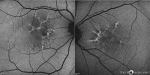 Vitelliform dystrophy is a pattern dystrophy. They are so called because the damage tends to ‘draw’ things on the retina. For example, one manifestation of the disease looks like a butterfly (photo to the right is a fundus photograph of butterfly pattern).